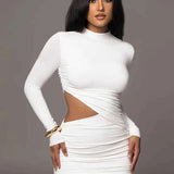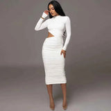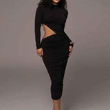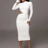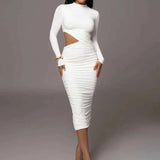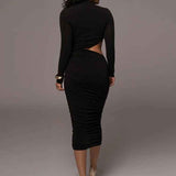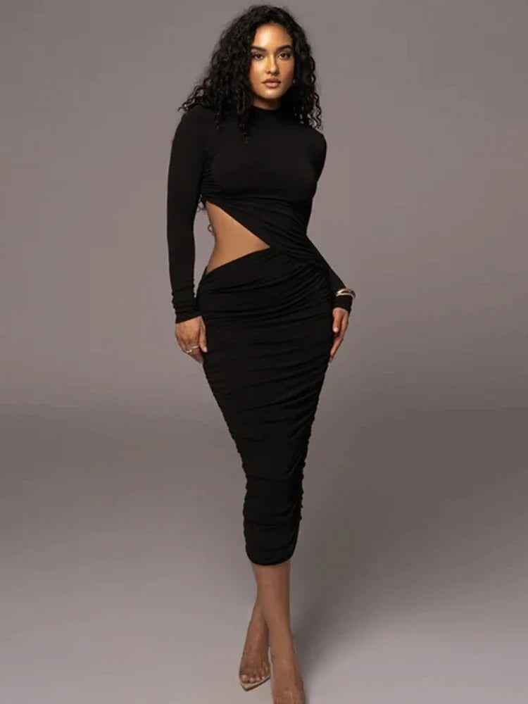 Vestido Midi Justo Drapeado com Recorte Lateral, Gola Alta e Manga Longa – Plouf